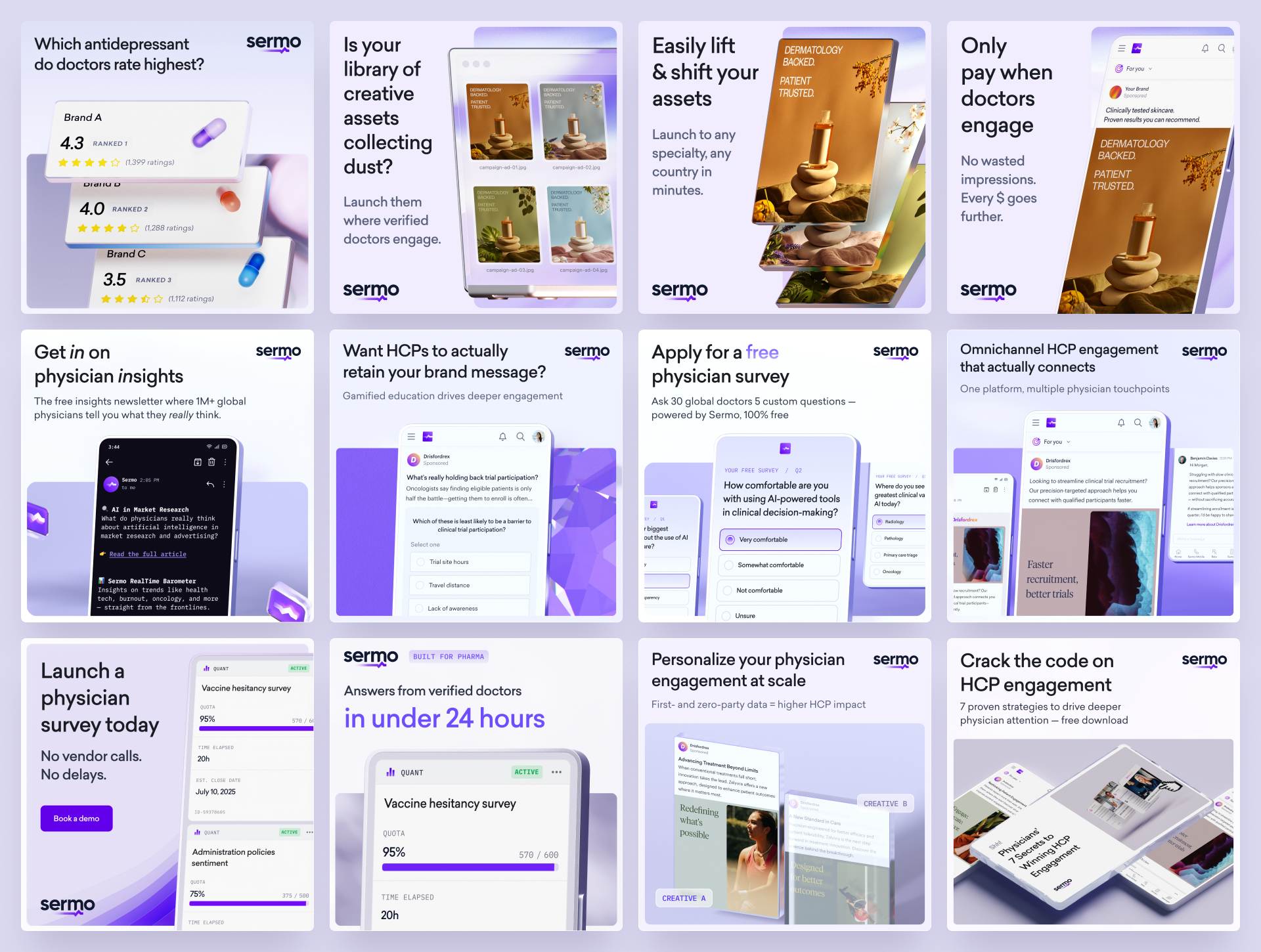 A select few out of hundreds of B2C ads I conceptualized and created as part of extensive, high-volume efforts led by the growth team — efforts that accelerated new physician user growth from 1k/mo to over 10k/mo over the span of 2 years.